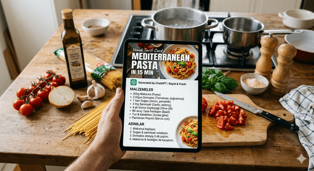 - Sonuç: Size sadece tarif vermekle kalmaz, bu malzemelerin kalori değerlerini hesaplar ve en sağlıklı pişirme yöntemini önerir.